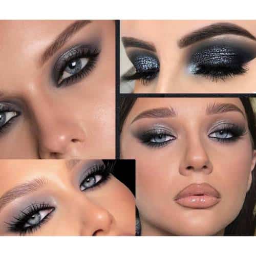 - نکته اجرا: خاکستری دودی در کل پلک، نقرهای در مرکز و آبی تیل بهعنوان خط چشم زیرین یا در گوشه خارجی برای ایجاد تضاد.