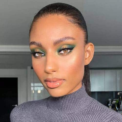 - نکته اجرا: سبز زمردی روی اغلب بخش پلک، مسی در گوشه خارجی و طلایی روی مرکز یا خط زیر ابرو.