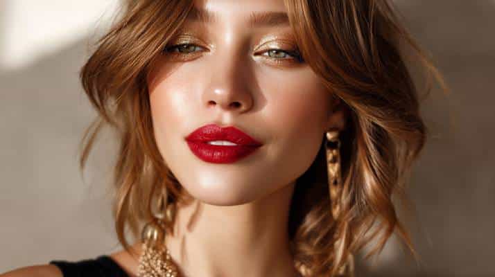 بهترین ست: رژ لب قرمز تیره برای کابوآ و هایلایتر طلایی ملایم برای یک هاله گرما